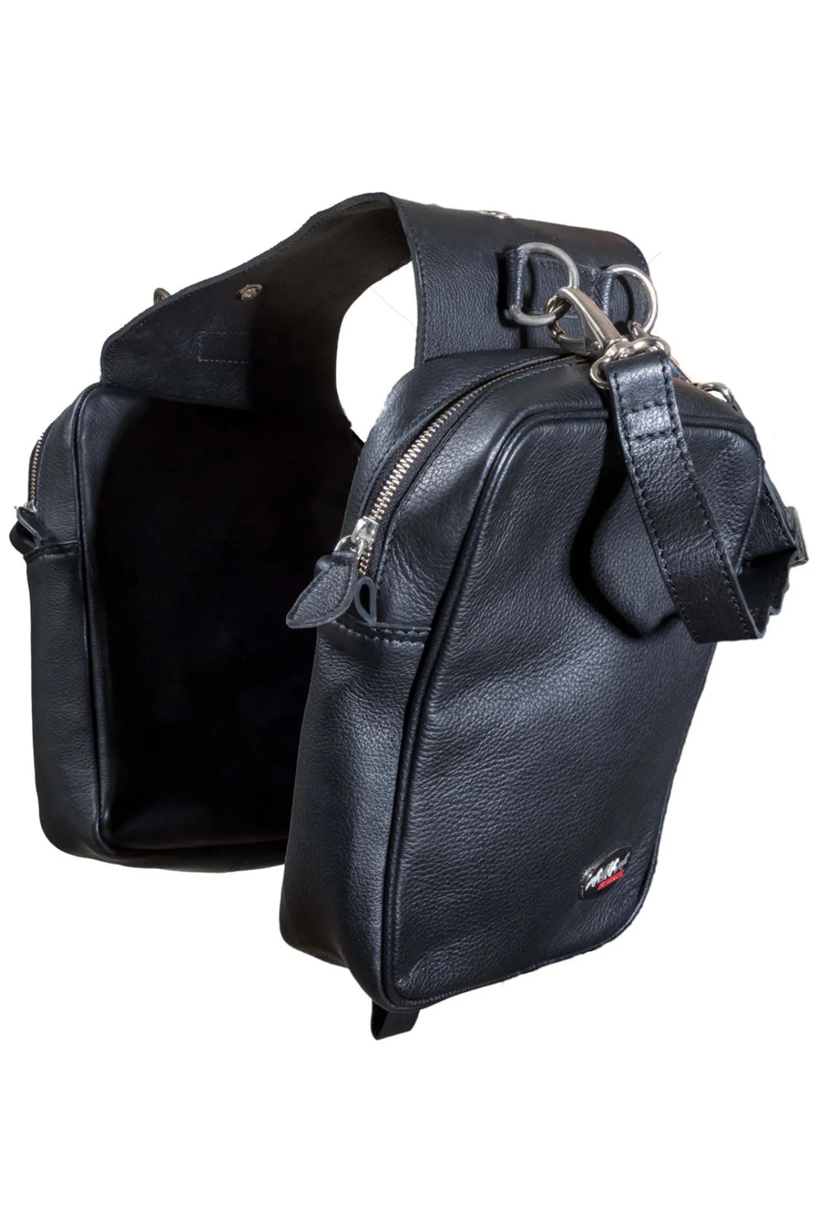 Salvesker i lær i super kvalitet.Festes trygt med to stropper til salen.Den kan brukes både foran og bak salen.Kommer med et rom på hver side av hesten, med glidelåslukking.