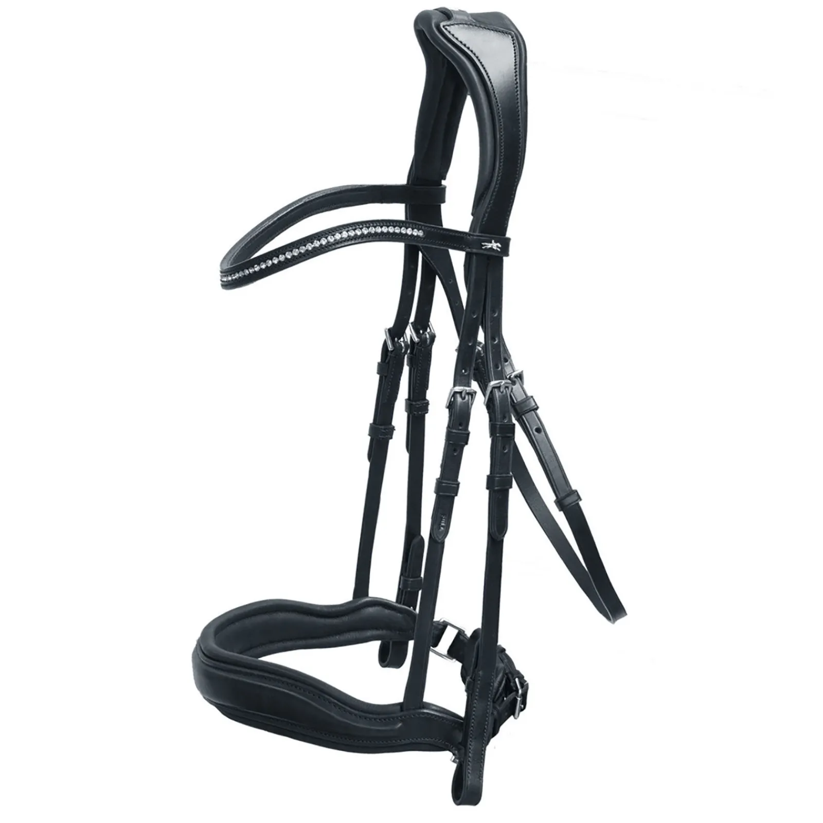 SLIMFORD kombinerer funksjonalitet og sportslig design: Hodelaget med anatomisk formet pullback-nesereim har et unikt nakkestykke. Dette er særlig formet etter hestens anatomi og gir ubegrenset bevegelsesfrihet til ørene. På grunn av reduksjon av trykk på sensitive områder rundt kinnbein og nakke er hestens komfort betydelig forbedret. Den formede nesereimen har ikke nedre nesereim. SLIMFORD kommer med to pannebånd: Ett enkelt pannebånd i lær og et med et smalt krystallkjede.FS-XL er kun tilgjengelig i svart/sølv.