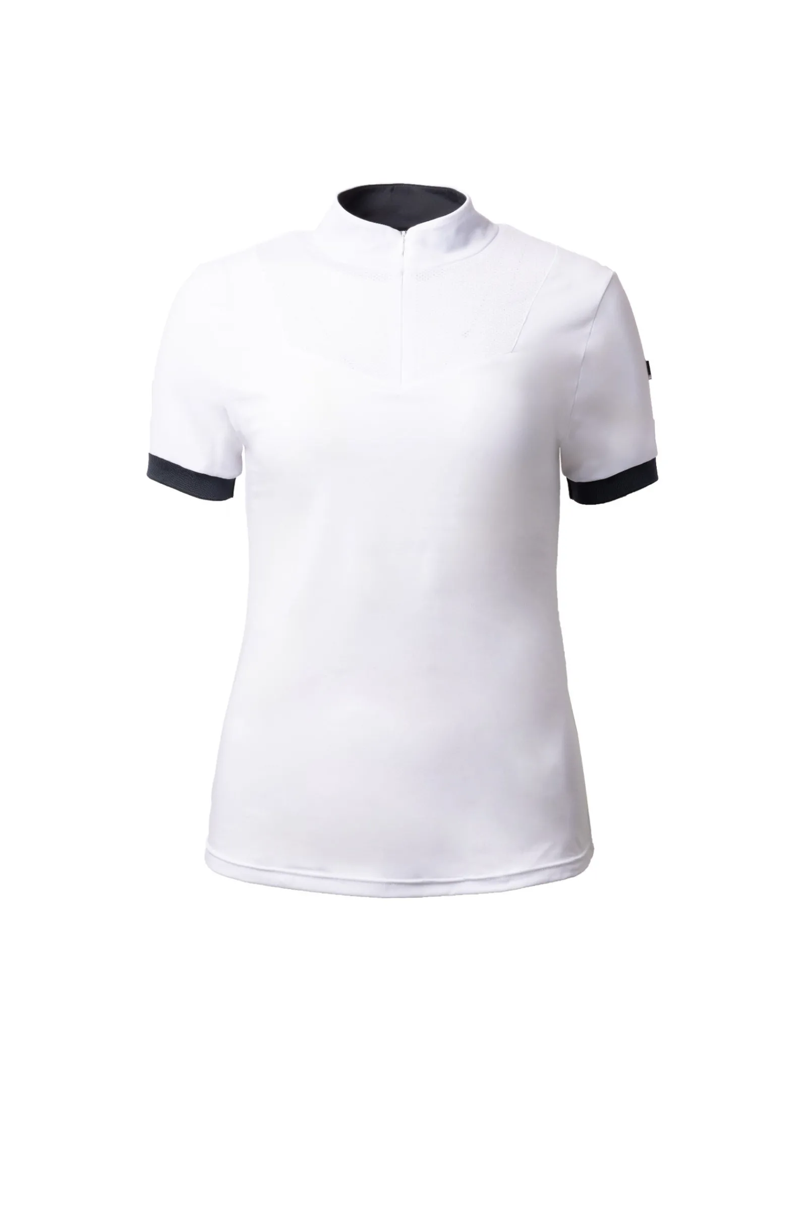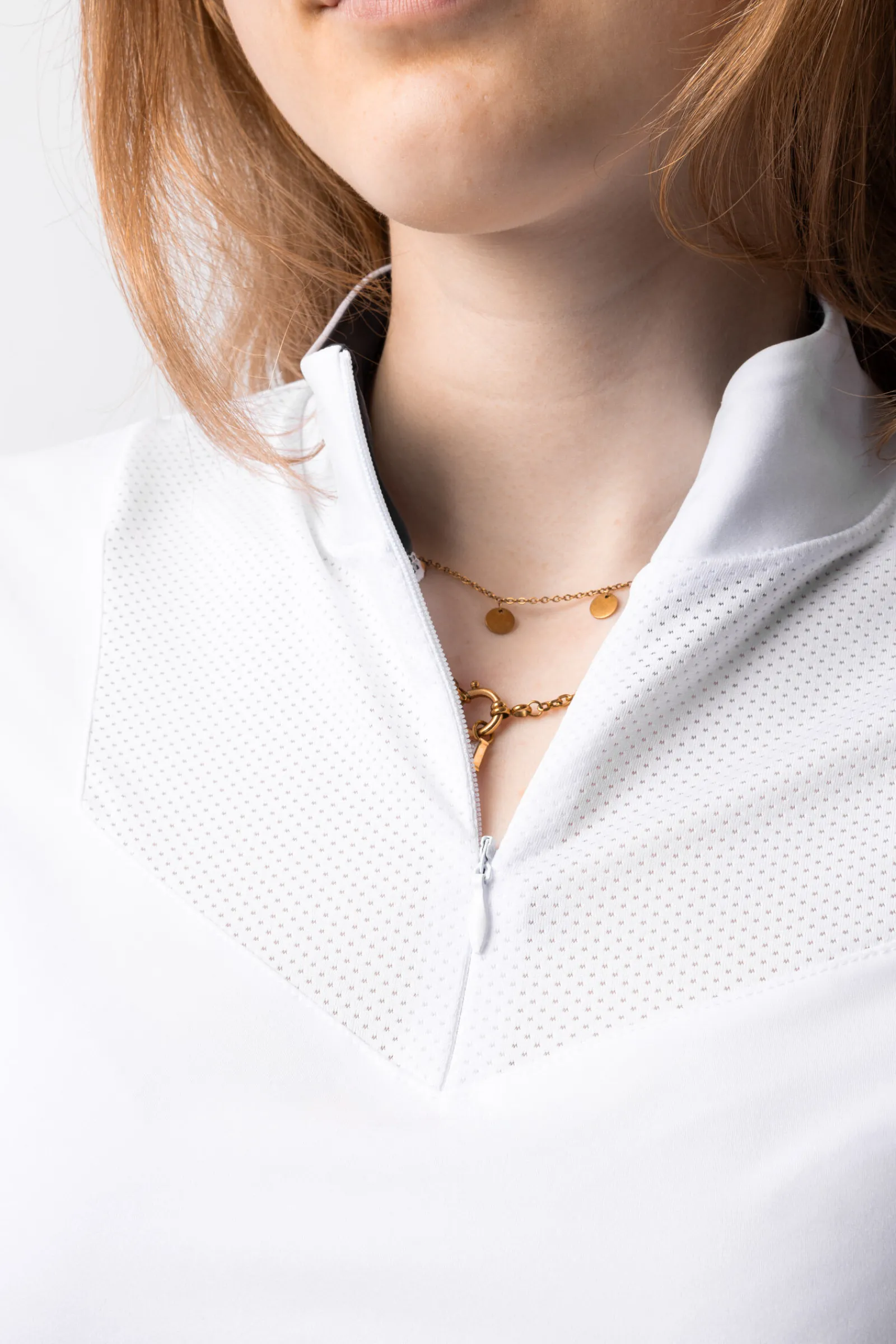 Kragen på denne nydelige stevneskjorten er ideell å bruke under konkurranse, men kan også glides ned slik at skjorta kan brukes under vanlig trening. Nettingstoffet på brystet og ryggen gir ekstra luftgjennomstrømning for maksimal funksjonalitet. Glidelåsen er enkel å bruke og gir deg muligheten til å endre raskt. Formen er sporty, men feminin og passer til flere ulike sammenhenger. Stoffet er mykt, men holdbar, noe som gjør det ideelt for aktive ryttere.