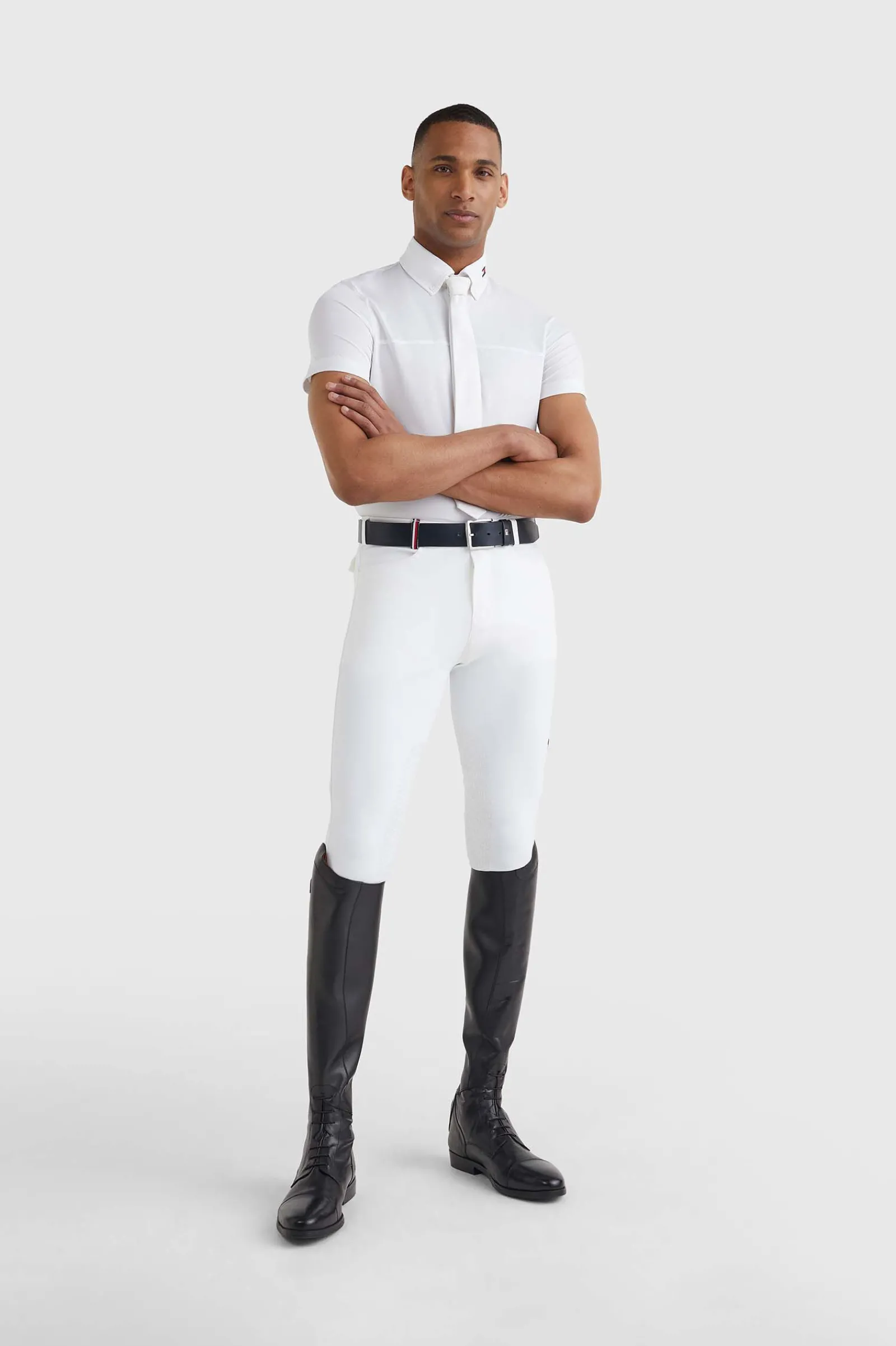 En tidløs, tettsittende, kortermet stevneskjorte med lang knappestolpe og skinnende hvit Mao-krage.Lite logobroderi på kragen, TH Global stripe-bånd midt på bak, og under knappestolpen.